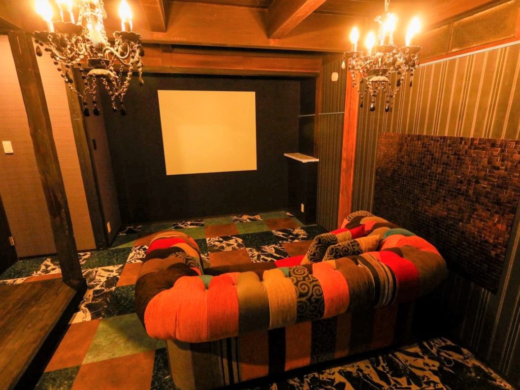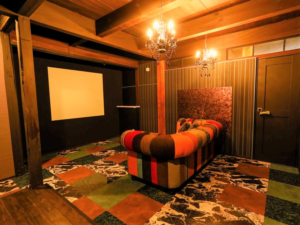 落ち着いた雰囲気のリビングはスクリーンになっている壁に映画などを映してくつろぎながら鑑賞していただけます。